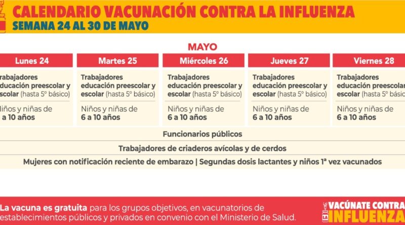 El Gobierno de Chile, dio a conocer el calendario de Vacunación, contra la Influenza, desde el lunes 24 hasta el domingo 30 de Mayo…