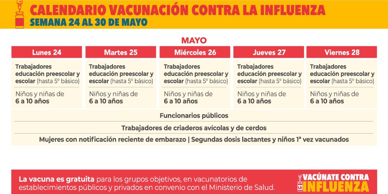 Calendario de Vacunación contra la Influenza, desde el lunes 24 hasta el domingo 30 de mayo