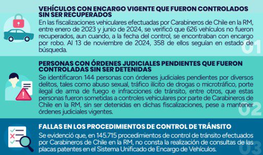 Santiago, Chile – Un reciente informe de la Contraloría General de la República (CGR) ha puesto en entredicho la efectividad de los controles de tránsito realizados por Carabineros de Chile. Según el documento, la institución policial no habría detenido a 144 personas con órdenes judiciales pendientes y tampoco recuperó 626 vehículos que contaban con encargo por robo, pese a haber sido fiscalizados.