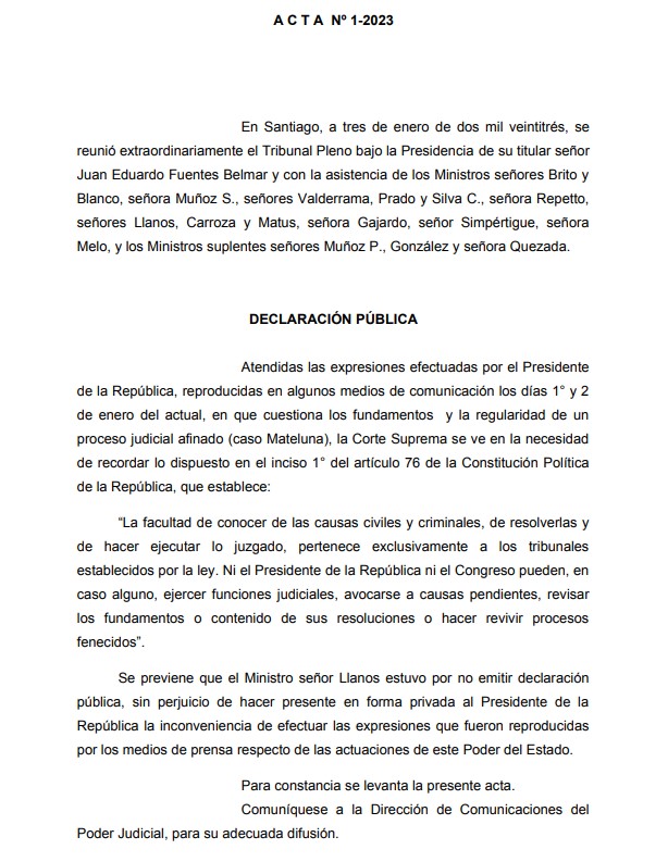 Atendidas las expresiones efectuadas por el Presidente de la República, reproducidas en algunos medios de comunicación los días 1° y 2 de enero del actual, en que cuestiona los fundamentos y la regularidad de un proceso judicial afinado (caso Mateluna), la Corte Suprema se ve en la necesidad de recordar lo dispuesto en el inciso 1° del artículo 76 de la Constitución Política de la República.