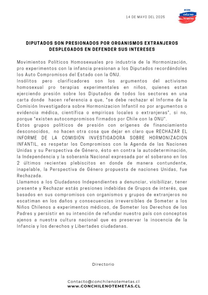 Santiago, Chile – Un grupo de diputados ha denunciado presiones por parte de organizaciones extranjeras y movimientos activistas ligados a la defensa de terapias de hormonización en menores de edad, en el marco de la votación del informe de la Comisión Investigadora sobre Hormonización Infantil, recientemente aprobado por la Cámara Baja.