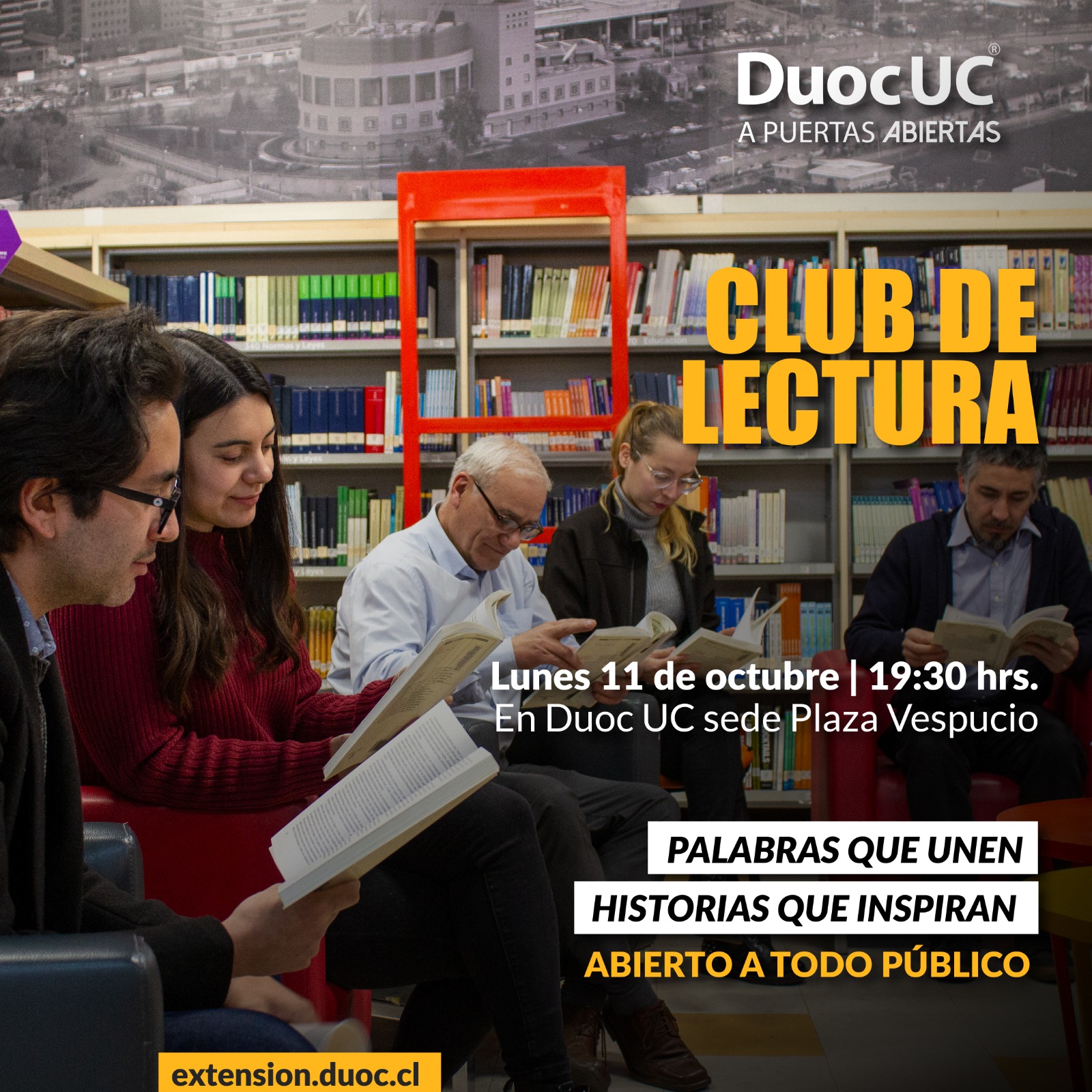 Duoc UC sede Plaza Vespucio abre sus puertas a la comunidad para que sean parte del nuevo Club de Lectura, espacio de diálogo cuyo objetivo es compartir impresiones, análisis y reflexiones diversas en torno a la lectura de obras literarias de todo tipo. Todos los meses se reunirá el grupo en la Biblioteca para conversar respecto de los diferentes libros.