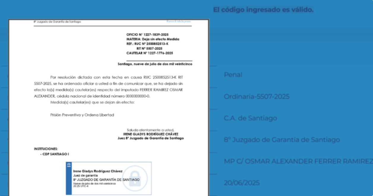 La polémica estalló luego de que el Octavo Juzgado de Garantía de Santiago, tras haber decretado prisión preventiva para Ferrer Ramírez y otros dos implicados el pasado 9 de julio, emitiera una orden de libertad para el acusado, cuyo origen es aún un misterio. Pese a que el documento de liberación es auténtico y cuenta con la firma electrónica de la jueza Irene Rodríguez, no hubo una nueva audiencia que justificara tal decisión, lo que ha generado confusión y alarma.