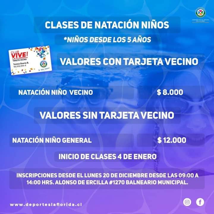 Natación Tarjeta Vecino: $8.000 (horario AM)